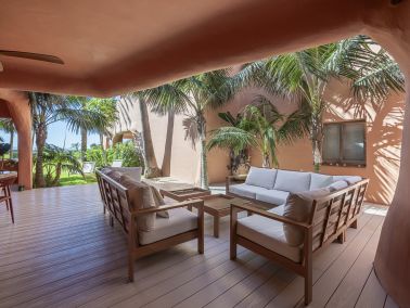 Rodeado de exuberantes palmeras y árboles maduros, el apartamento cuenta con amplias y acogedoras terrazas que invitan a disfrutar del sol, la brisa marina y las impresionantes vistas. Los espacios exteriores incluyen un comedor, una zona de barbacoa y un cómodo salón con sofás y sillones. Gran parte de la terraza está cubierta, proporcionando una agradable sombra y manteniendo el relajante ambiente mediterráneo.