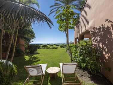 Este apartamento de diseño exquisito se encuentra en una de las urbanizaciones más prestigiosas frente al mar de Playa Los Monteros, con seguridad las 24 horas y un estilo de vida exclusivo. Ubicado en la planta baja, en uno de los bloques más cercanos a la playa, el inmueble disfruta de hermosas vistas al mar y al jardín desde sus terrazas, sala de estar y dormitorio principal.