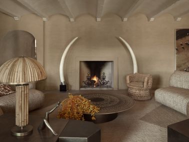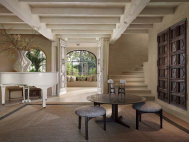 Casa de Invitados Dos: Inspirada en el diseño tropical, esta encantadora vivienda ofrece un acogedor salón con chimenea, cocina de concepto abierto, comedor y un dormitorio en suite. Entre sus características adicionales se incluyen un aseo de cortesía, sala de masajes y un cuarto de herramientas/almacenamiento.
