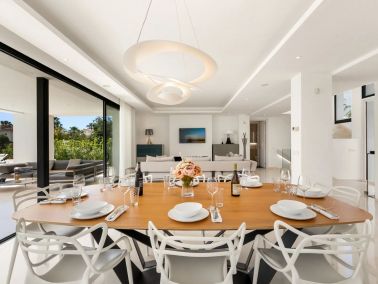 Designed for contemporary Mediterranean living, the property features five beautifully appointed bedrooms and five bathrooms, including an elegant master suite with its own private terrace and open views. Generous interiors flow naturally towards the outdoor spaces, creating a serene living environment framed by garden and pool views and centred around a welcoming fireplace.