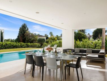 Outdoors, an expansive terrace unfolds into several relaxed lounge areas, a large swimming pool and a dedicated barbecue and dining space, offering the perfect setting to enjoy long, sun-filled days and gentle evenings in the heart of the Costa del Sol.