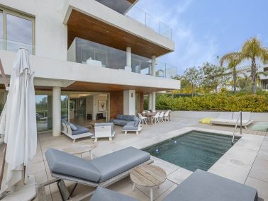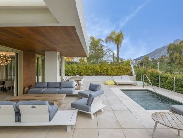 De woning beschikt over vijf ruime slaapkamers, elk met een eigen badkamer, plus een extra gastentoilet. Het interieur is volledig gemeubileerd en verkeert in uitstekende staat, met een open keuken die volledig is uitgerust en een aparte eetkamer. De woonkamer biedt toegang tot een privéterras met panoramisch uitzicht op zee, de bergen, het zwembad, de tuin en de straat. Dankzij de grote raampartijen en glazen deuren geniet men van veel natuurlijk licht en een naadloze verbinding tussen binnen- en buitenruimtes.