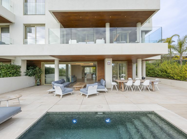 Wat betreft comfort en veiligheid is deze triplex voorzien van airconditioning, individuele A/C-units, vloerverwarming door het hele huis en in de badkamers, dubbele beglazing, elektrische rolluiken, en aerothermische technologie. Het pand is uitgerust met een alarmsysteem, video-intercom, beveiligde ingang, rolluiken, 24-uurs beveiligingsdienst, conciërgeservice en een portier. Extra voorzieningen zoals een privézwembad met zoutwater en verwarming, een binnenzwembad, een sauna, een fitnessruimte, een spa en een gemeenschappelijke tuin verhogen het wooncomfort aanzienlijk.