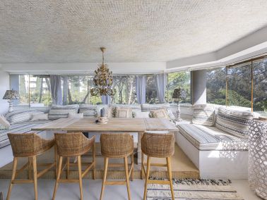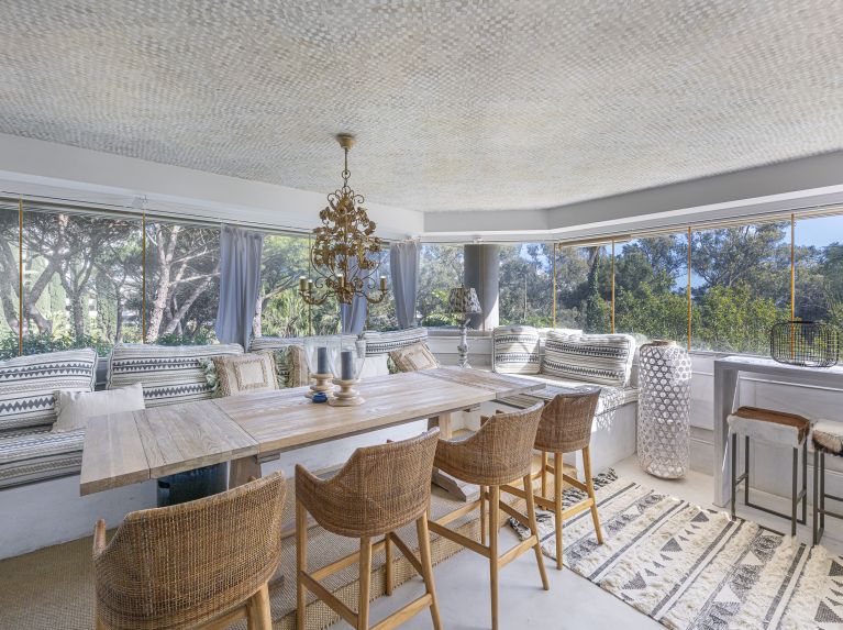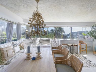 Bij binnenkomst wordt u verwelkomd in een stijlvolle hal die overgaat in een ruime en lichte woonkamer. Dankzij grote raampartijen geniet de leefruimte van overvloedig natuurlijk licht en een open sfeer. De woonkamer sluit naadloos aan op een royaal overdekt terras, waardoor binnen- en buitenleven perfect in elkaar overlopen. Dit terras vormt de ideale plek om te dineren in de open lucht of om te ontspannen terwijl u geniet van het prachtige uitzicht op zee en de omliggende tuinen.