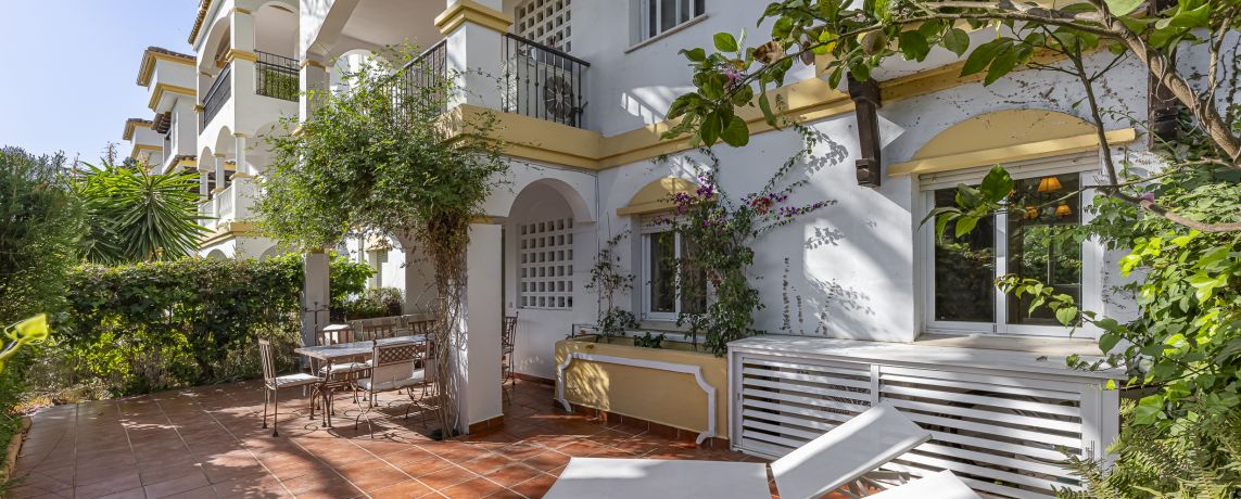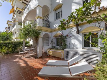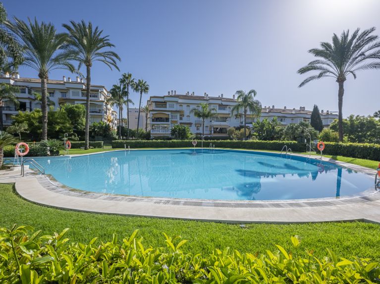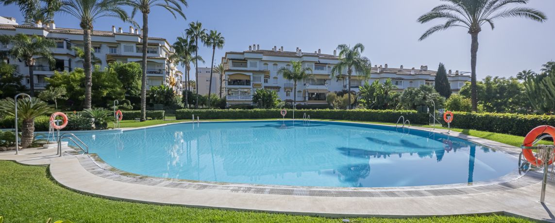 Appartement rez de chaussée à louer à Marbella Golden Mile, Marbella – Toutes les zones avec 2 chambres à coucher, 2 salles de bains, 2 salles de bain en-suite, construit dans 1998 et a garage (privé). Dimensions: 125m² construit et 55m² terrasse.