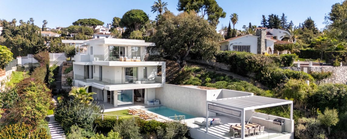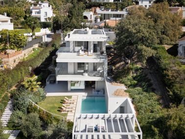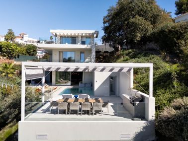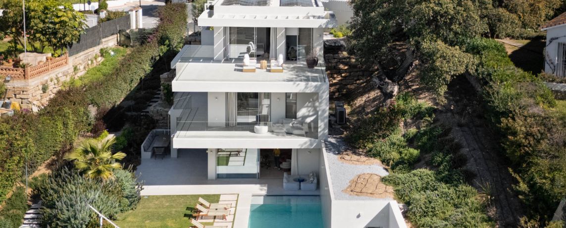 Superbe villa contemporaine à Elviria comprenant cinq chambres, une piscine chauffée et un jardin privé, le tout à quelques pas de la plage.