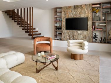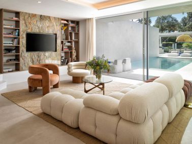 La pièce à vivre principale est spacieuse et baignée de lumière naturelle, ouverte sur une cuisine moderne entièrement équipée. De grandes baies vitrées du sol au plafond s’ouvrent directement sur les terrasses et le jardin, créant une harmonie parfaite entre les espaces intérieurs et extérieurs.